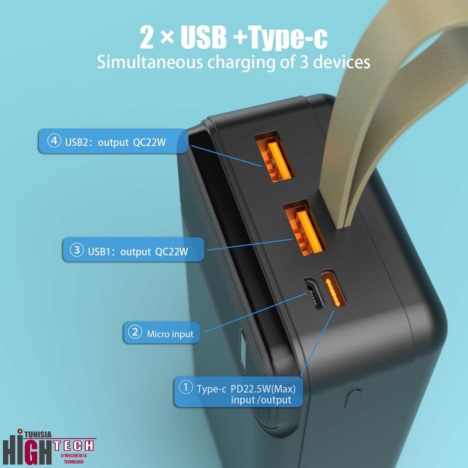 | 🔌 Ports de sortie | 3 ports USB-A + 1 port USB-C – permettent la charge simultanée de plusieurs appareils. |