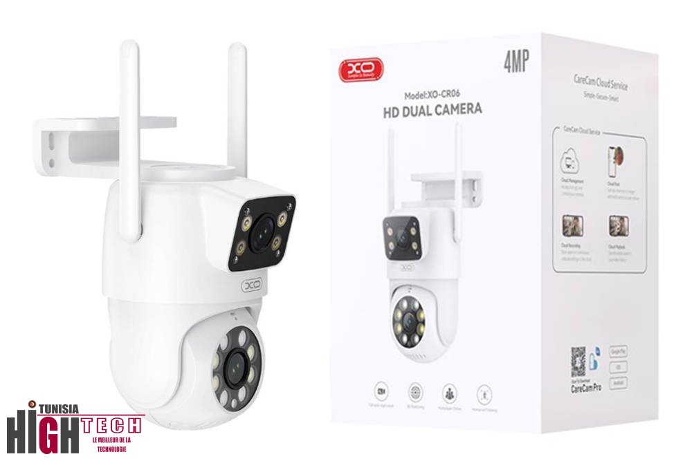 La XO CR06 Star est une caméra de surveillance extérieure haute définition équipée de deux objectifs pour une couverture panoramique complète. Elle offre une vision nocturne en couleur grâce à ses LED infrarouges et blanches, assurant une surveillance efficace jour et nuit. Dotée de la détection de mouvement avec suivi humain intelligent et de l'audio bidirectionnel, elle permet une interaction en temps réel. Sa connectivité Wi-Fi 2.4 GHz et Bluetooth facilite l'installation et la gestion via l'application mobile CareCam PRO. Robuste et étanche, elle est conçue pour résister aux conditions extérieures difficiles